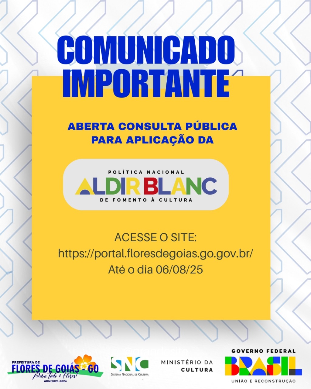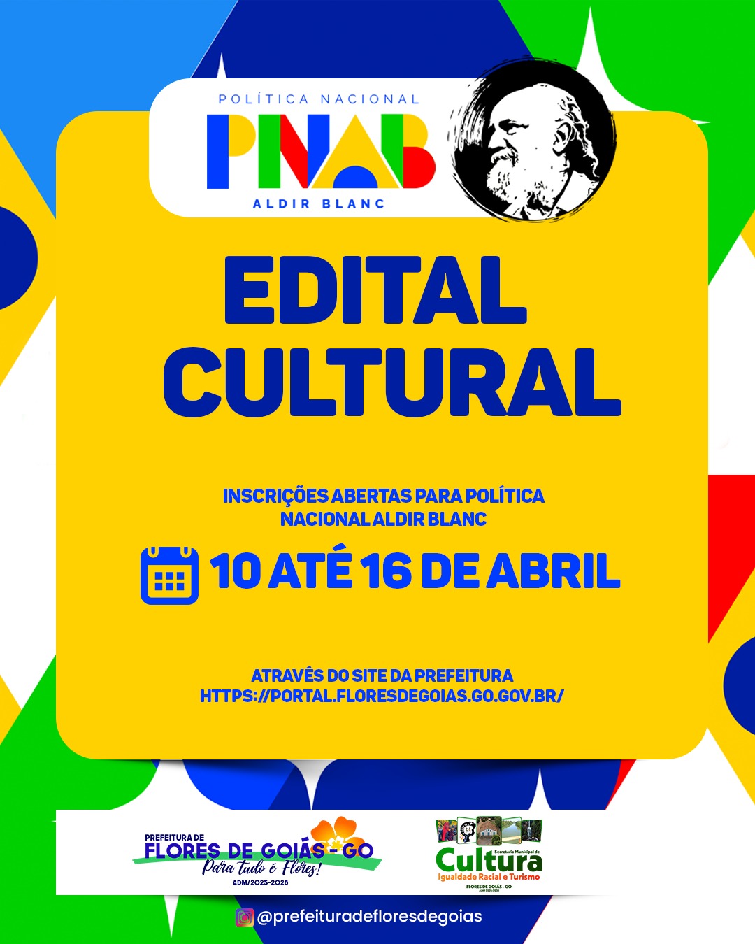 A Prefeitura de Flores de Goiás, por meio da Secretaria Municipal de Cultura, torna público que estão abertas as inscrições para o Edital Cultural da Política Nacional Aldir Blanc (PNAB). Os interessados podem se inscrever no período de 10 a 16 de abril, exclusivamente pelo site oficial da prefeitura: